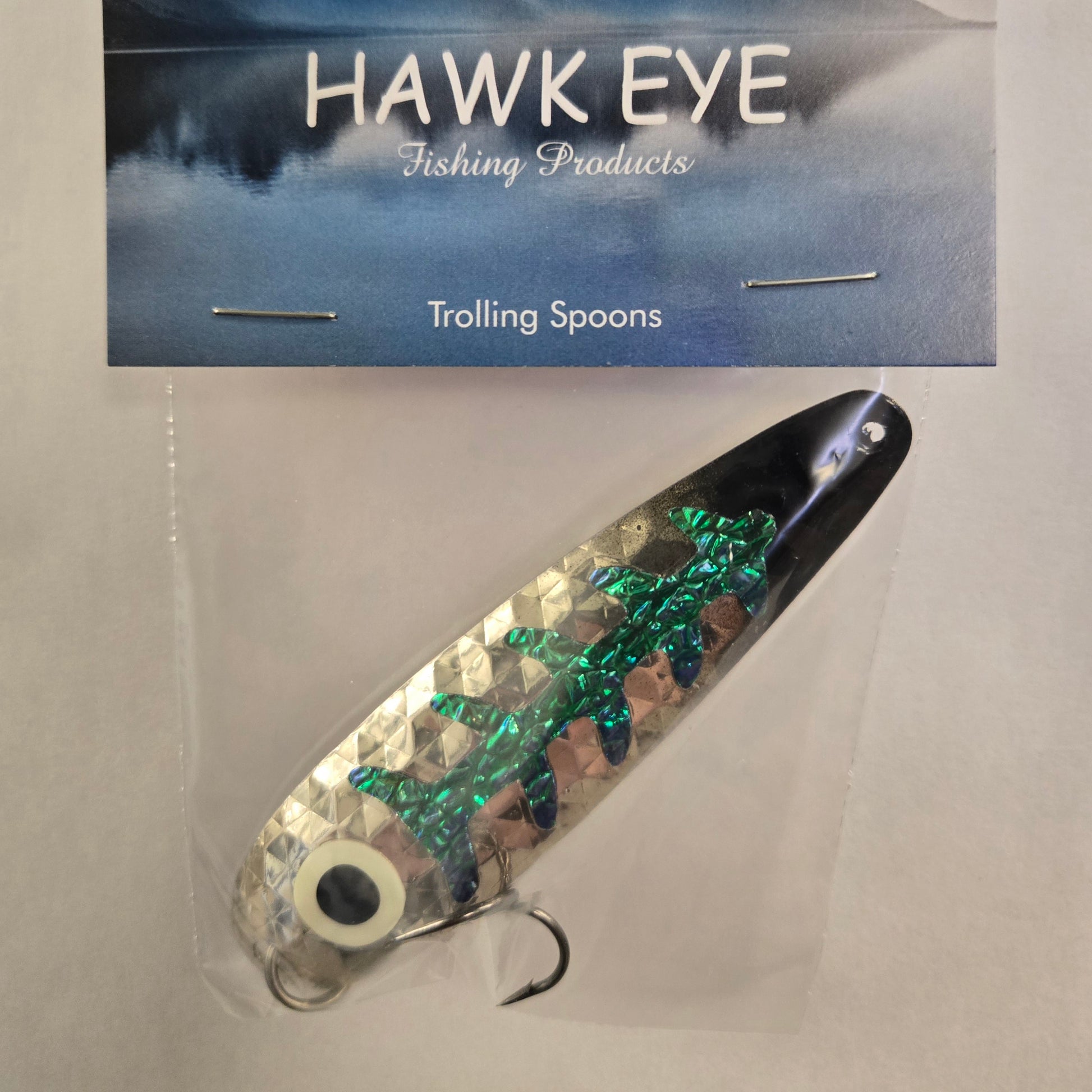The Hawk Eye 3 3/4" Trolling Spoon is a premium fishing lure designed to enhance your salmon trolling experience. Crafted in Ontario, Canada, this spoon features a balanced wobble action that effectively mimics the movement of baitfish, attracting salmon with its lifelike presentation. Constructed from high-quality materials, it boasts a durable, reflective finish that ensures maximum visibility underwater, even in varying light conditions.