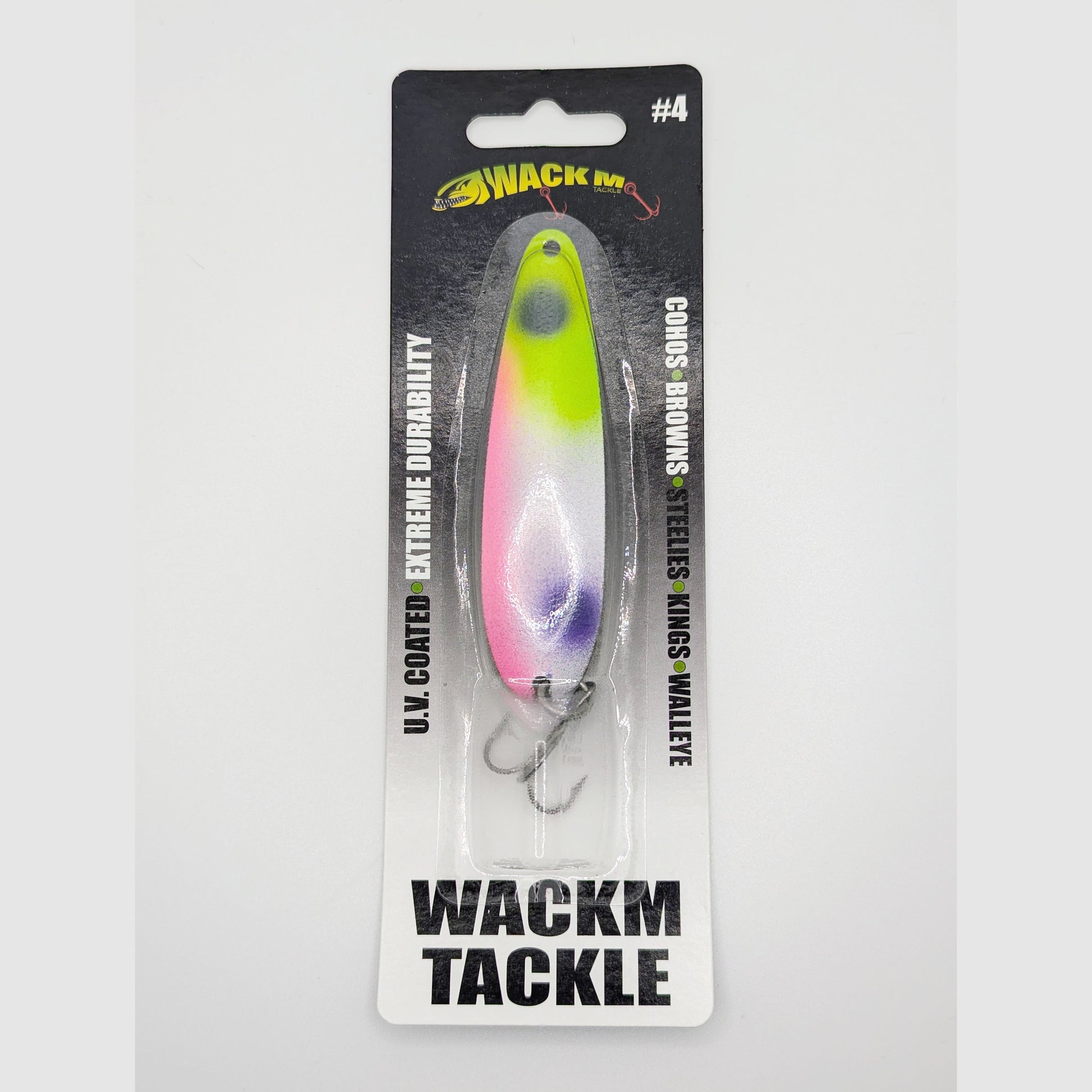 Les cuillères Wackm sont peintes individuellement et fabriquées à la main avec fierté. Notre système de peinture et notre technologie de cuisson confèrent à la cuillère une finition élégante et une durabilité suprême. Toutes nos cuillères sont peintes avec de la peinture UV, une finition UV ou les deux. Vous devrez tenir les cuillères à la lumière UV pour les voir. Ce n'est pas toujours ce que vous voyez, mais ce que le poisson peut voir !