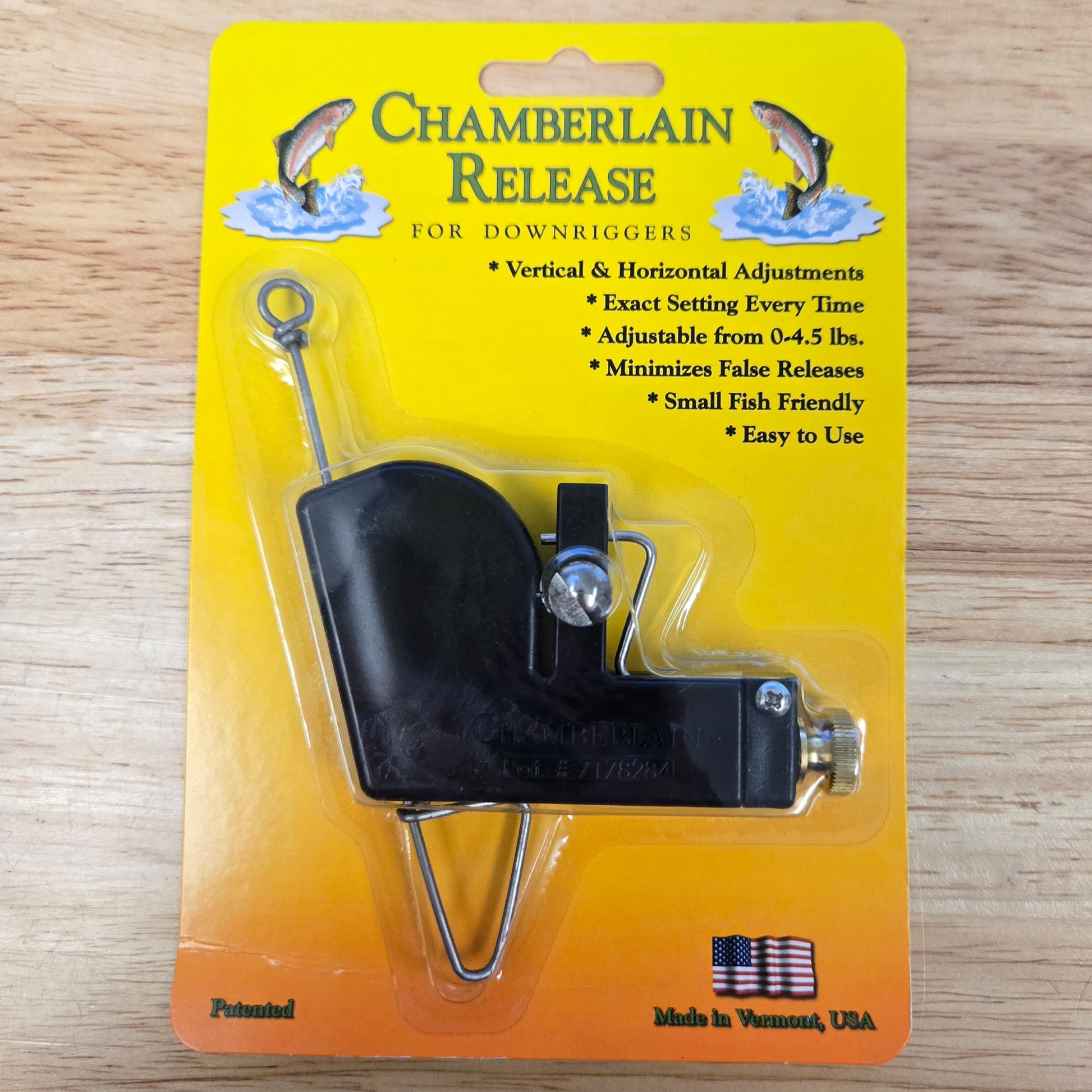 False releases and small fish that are not detected are the two major problems with downrigger fishing. The Chamberlain release is designed to eliminate both these problems with the patented design of two adjustments.
