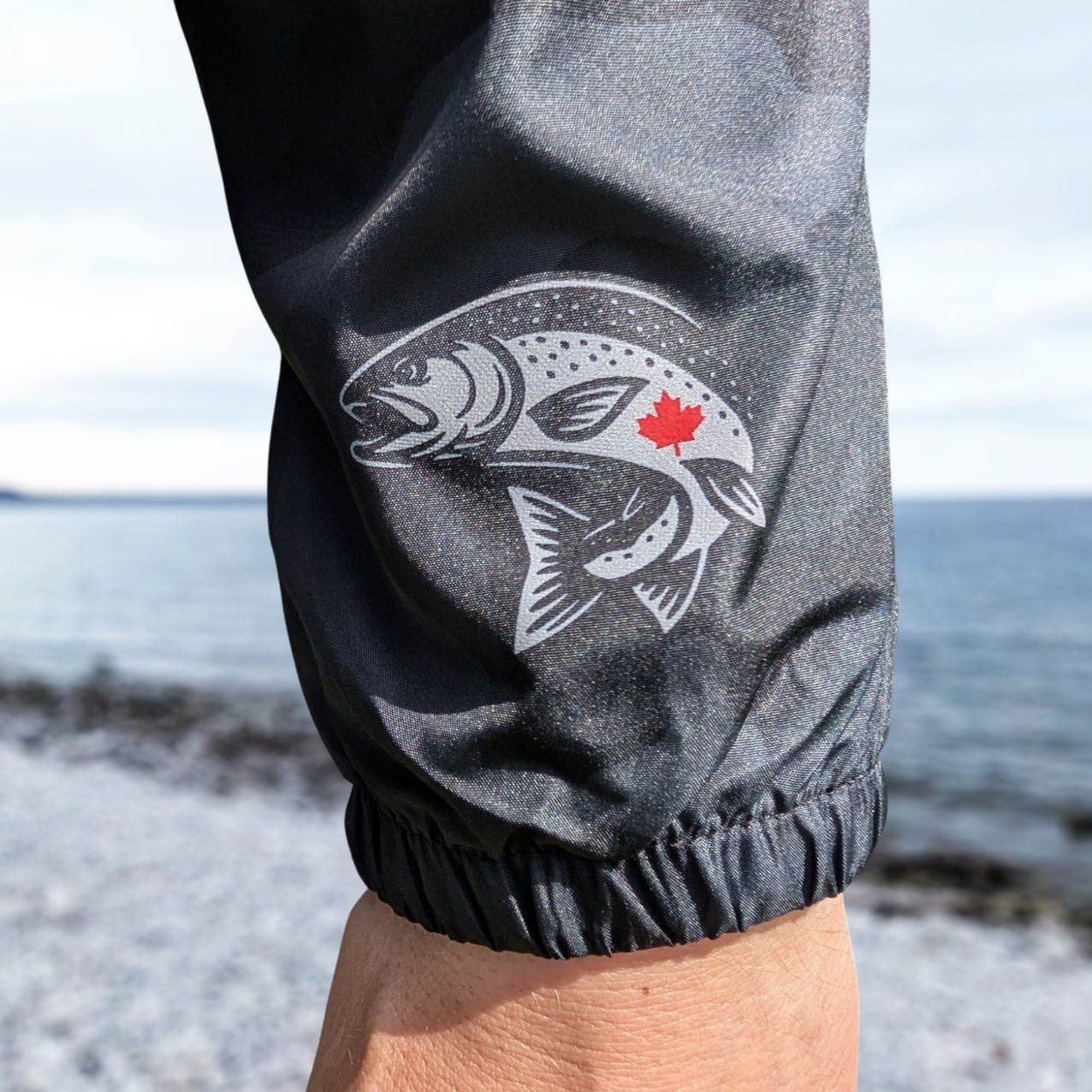 Built for the riverbank, the boat launch, and everything in between. The Dark Camo Rain Jacket keeps you dry without the bulk — featuring an ultra-lightweight, water-resistant shell in our dark camo pattern. Adjustable hood and waist, half-zip front, and a roomy kangaroo pocket with our signature brand on the chest, wrist, and back. Subtle, functional, and ready to fish.