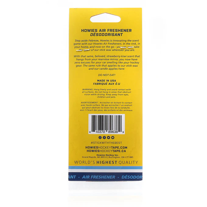 Step aside Febreze, Howies is taking over the scent game with our Howies Air Fresheners. In the rink, in your home, and now on the go - you can take the smell of our stick wax wherever you are. With that same, beloved, strawberry-kiwi scent that hangs from your rearview mirror, you now have zero excuses for your car smelling like your hockey gear. The same rule that applies to our stick wax and our candle applies here, do not eat!