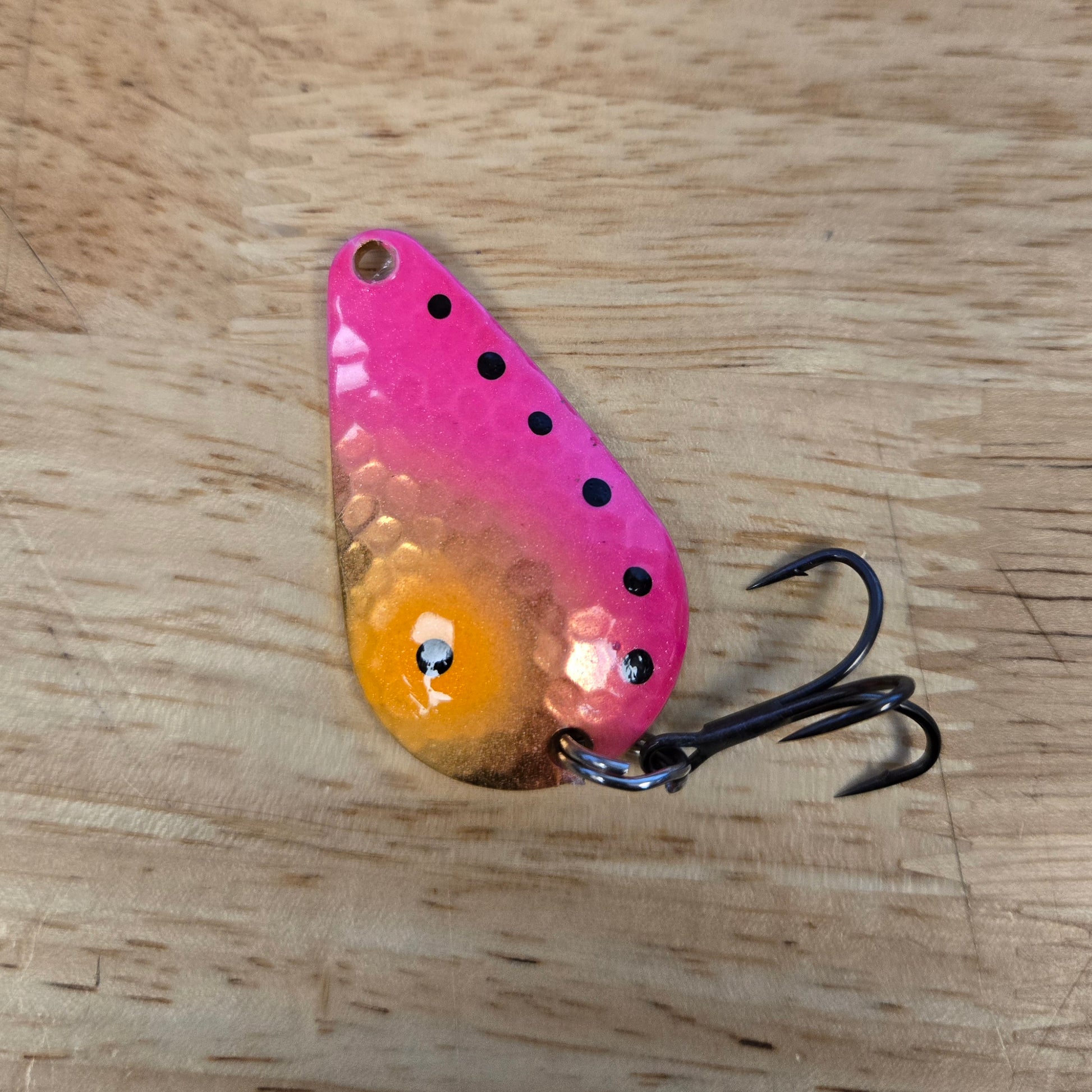 Distinctive tear drop shaped casting spoons in two versatile sizes, featuring a unique, fish attracting wobbling action, durable 2X strength hooks, durable split rings and our "Fish On" topcoat.
