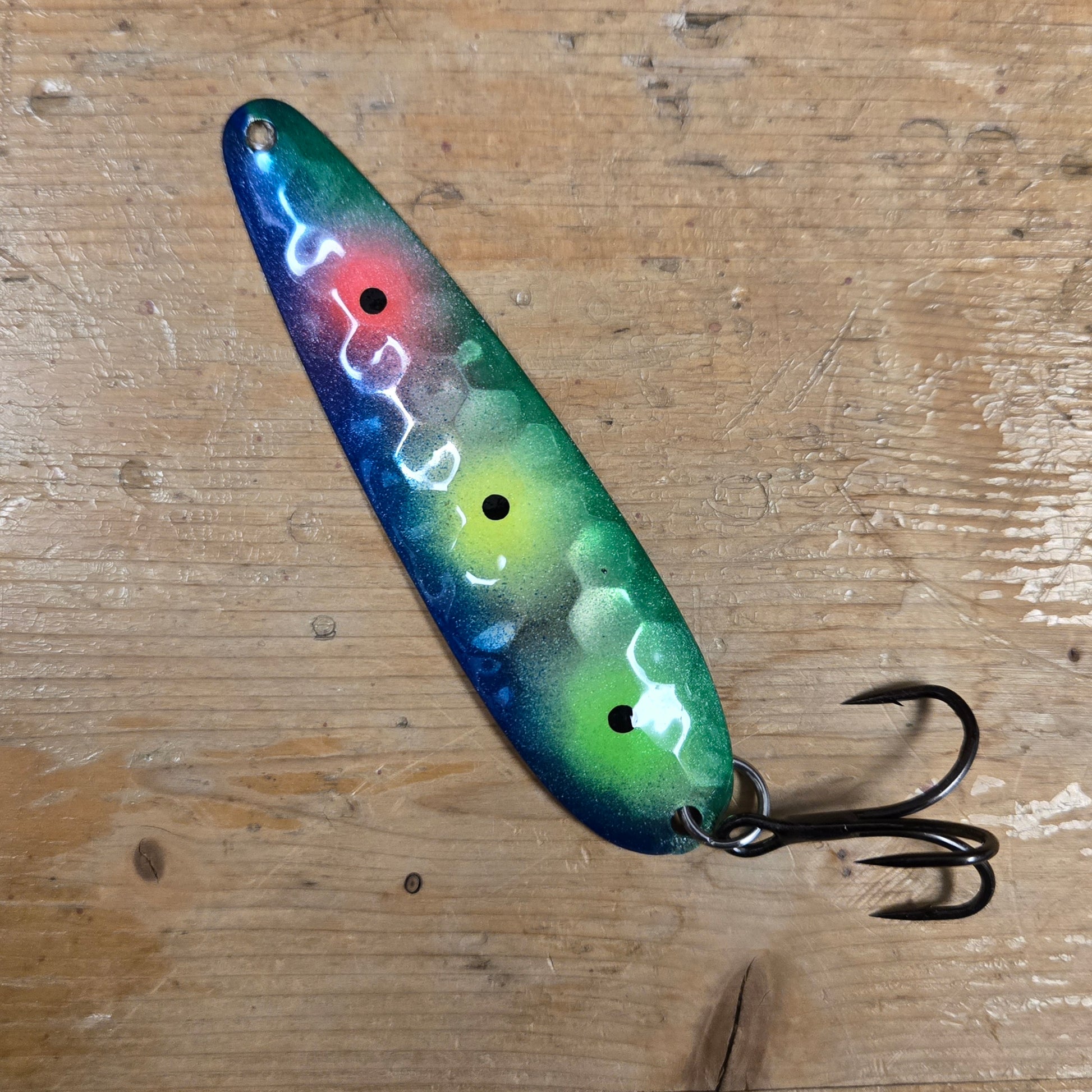 These high quality trolling spoons are designed to elevate your fishing experience. They have an irresistible fluttering action that sets them apart. At TNT Fishing Lures we use only quality American made blanks, solid stainless heavy duty split rings, 2x strength VMC treble hooks, high quality paints and a UV protective durable top coat.