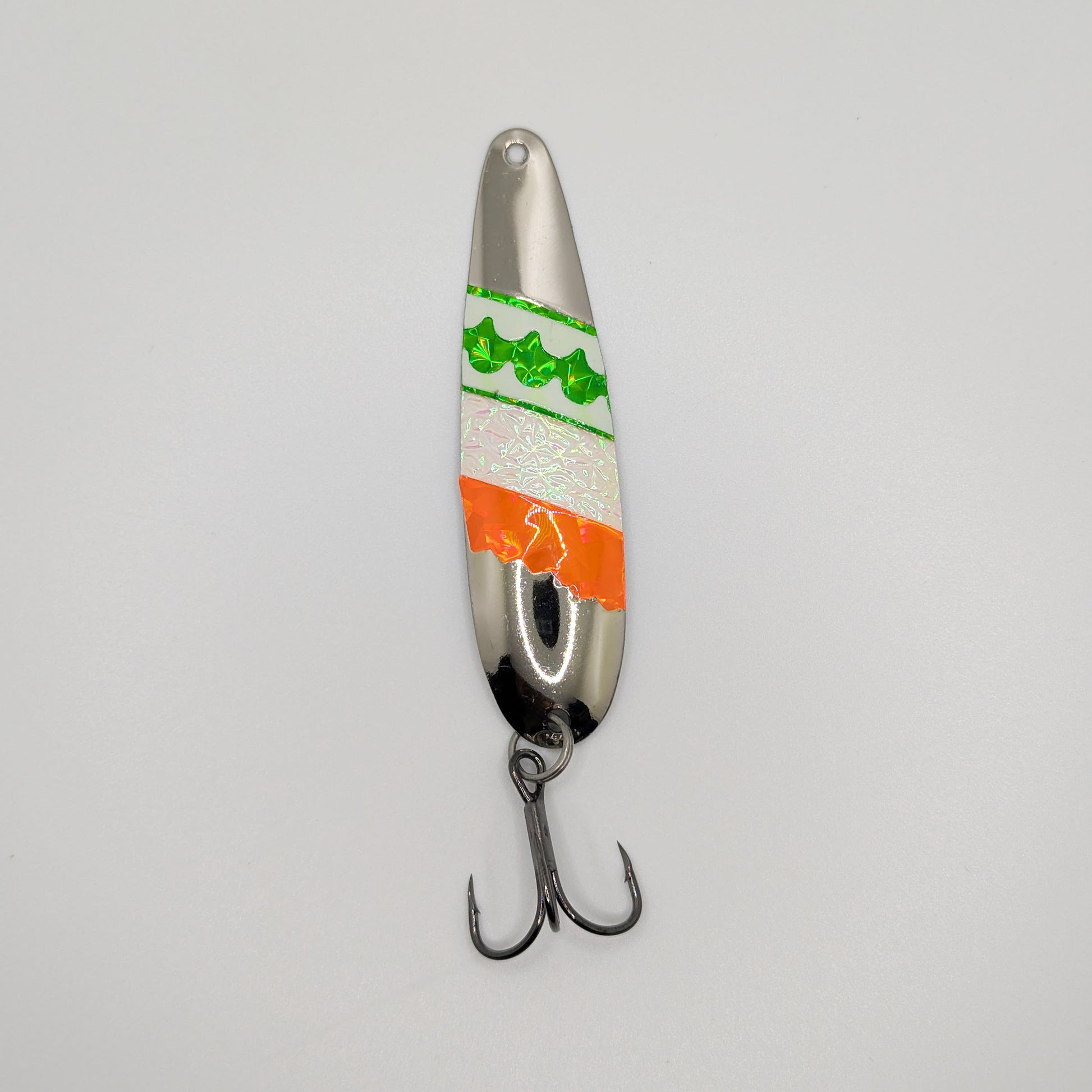 These high quality, lightweight trolling spoons are designed to elevate your fishing experience. They have an irresistible fluttering action that sets them apart. At TNT Fishing Lures we use only quality American made blanks, solid stainless heavy duty split rings, 2x strength Torpedo treble hooks, high quality paints and a UV protective durable top coat.